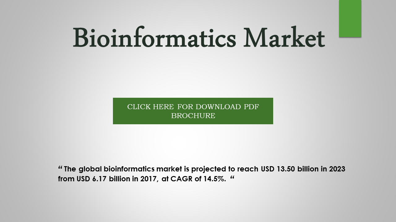 * The global bioinformatics market is projected to reach USD 13.50 billion in 2023 from USD 7.73 billion in 2018, at CAGR of 14.5%.